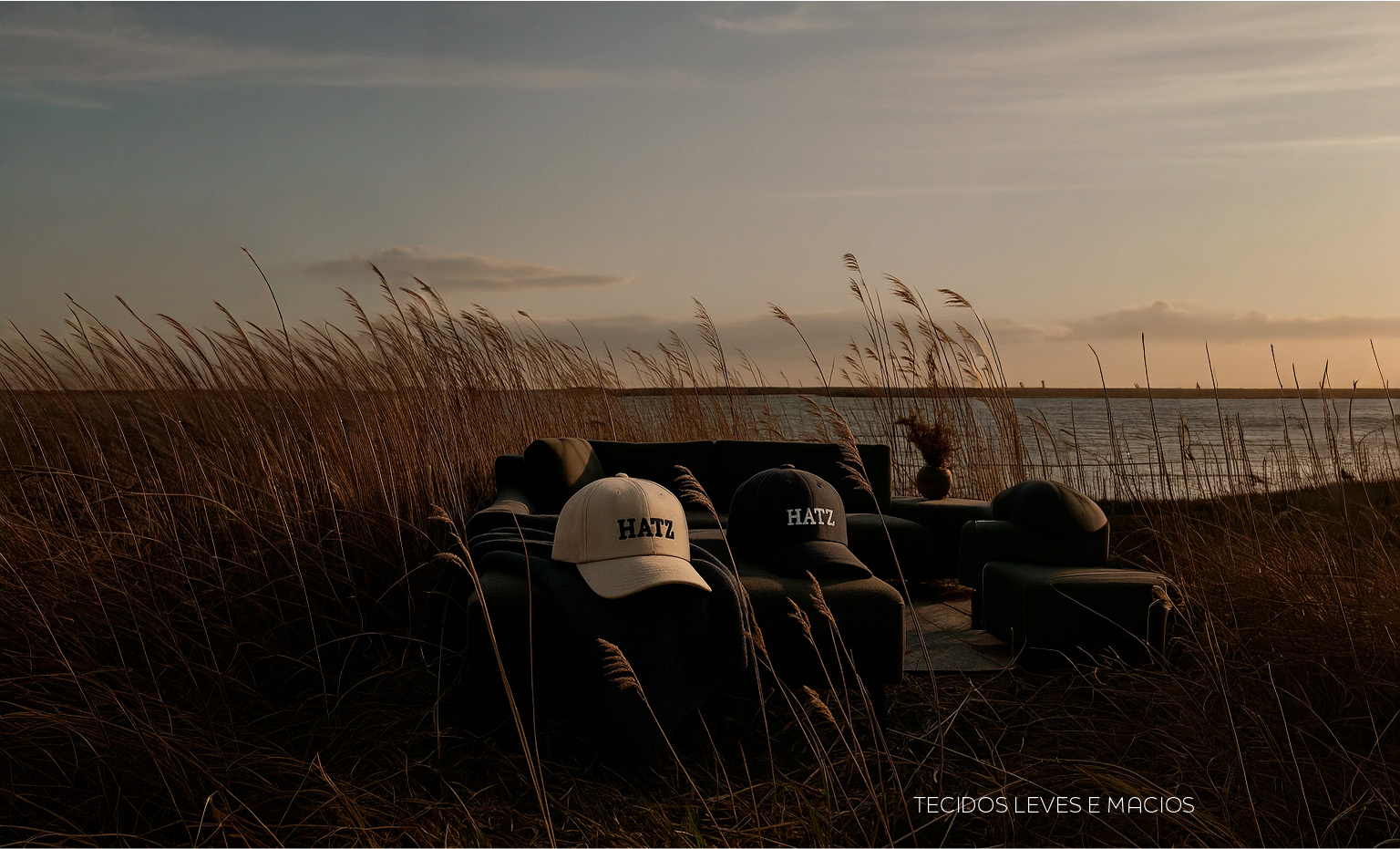 A HATZ nasceu na beira do mar e foi testada no corre da cidade. Bonés leves com costura alinhada, respiradores que deixam o vento passar e interior macio pra aguentar o dia todo.