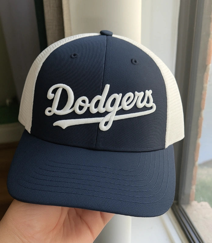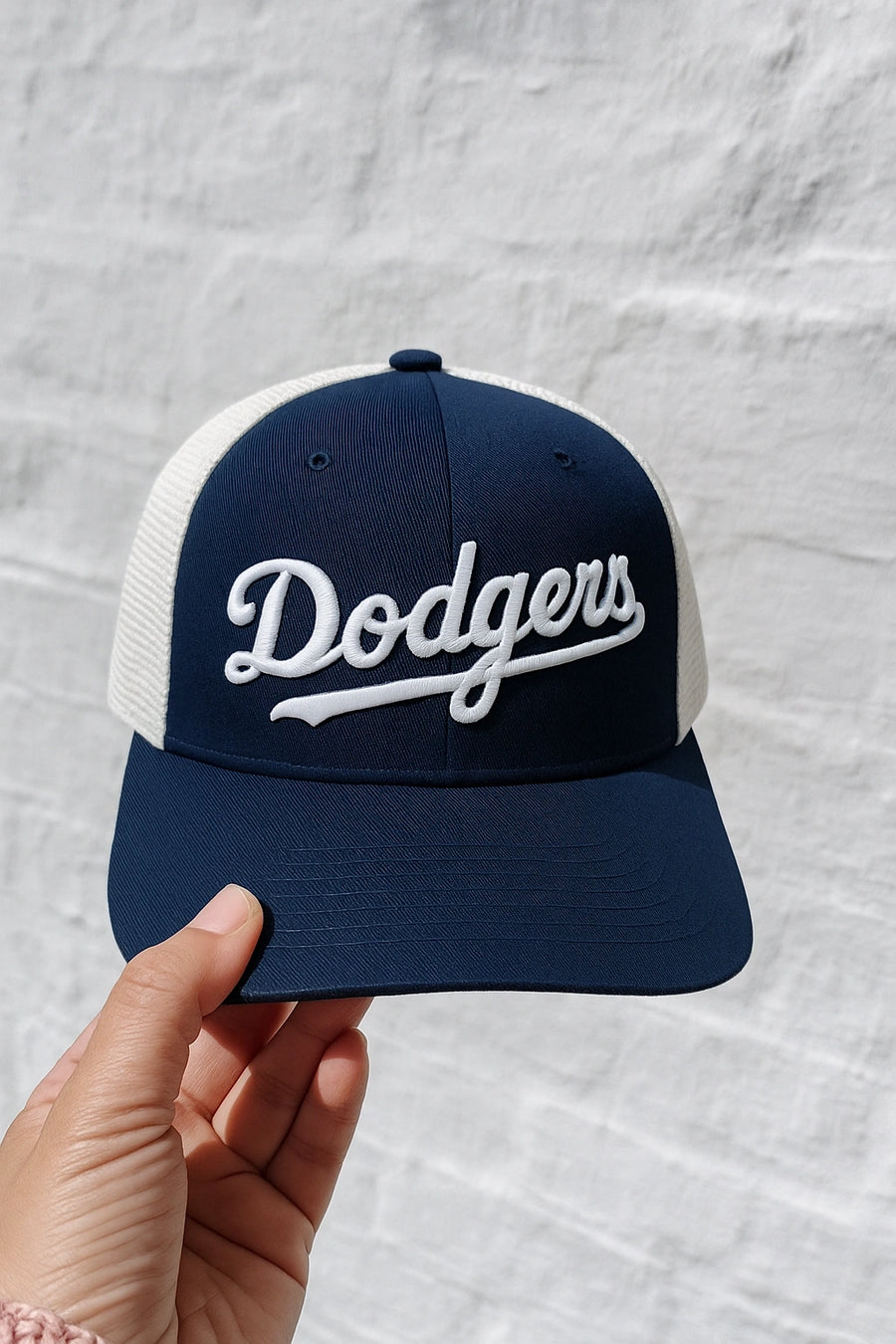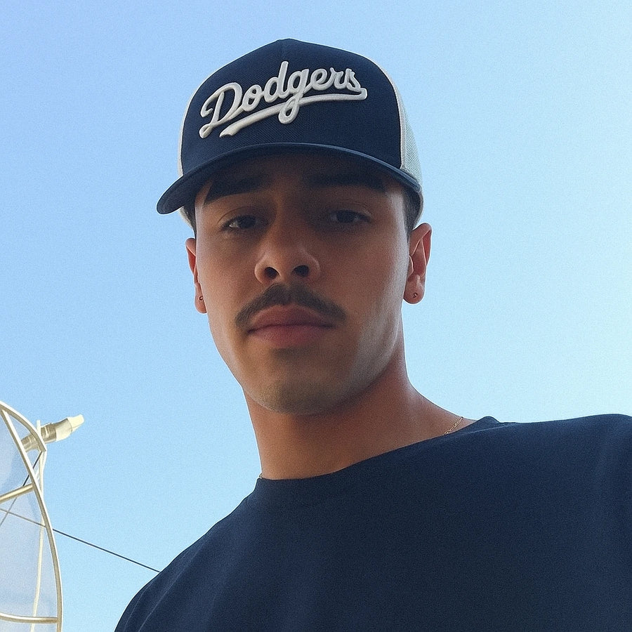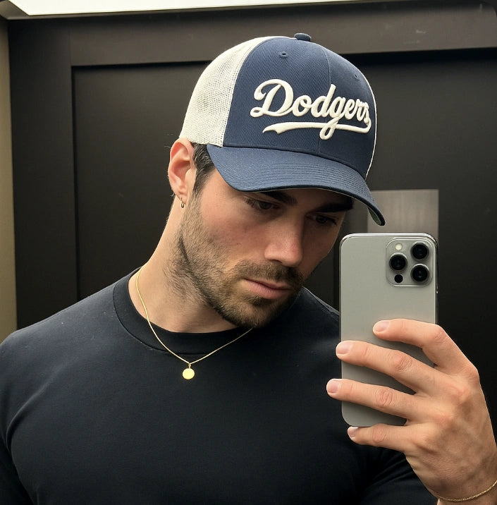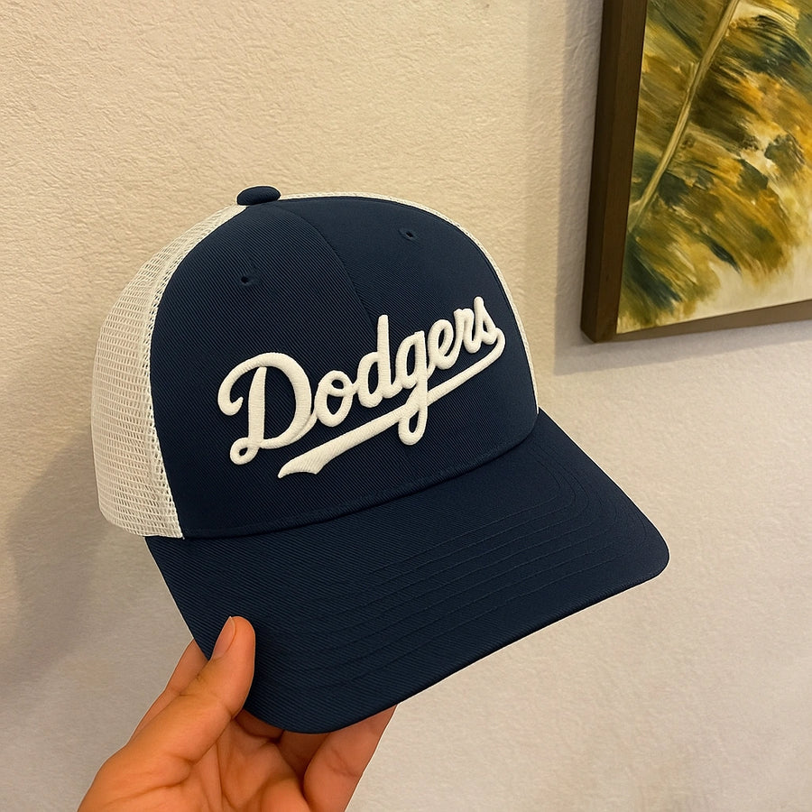 O Boné Dodgers combina frente em tecido encorpado com laterais em mesh respirável, criando um equilíbrio entre presença forte e uso confortável.