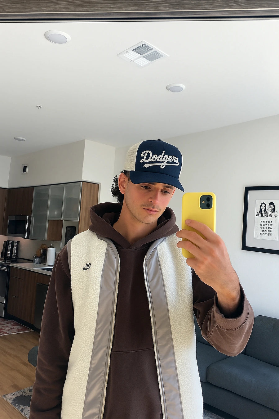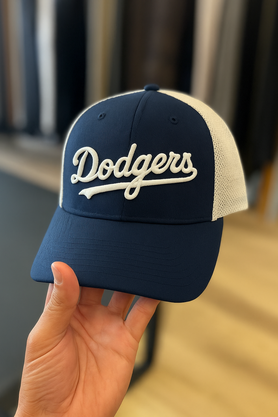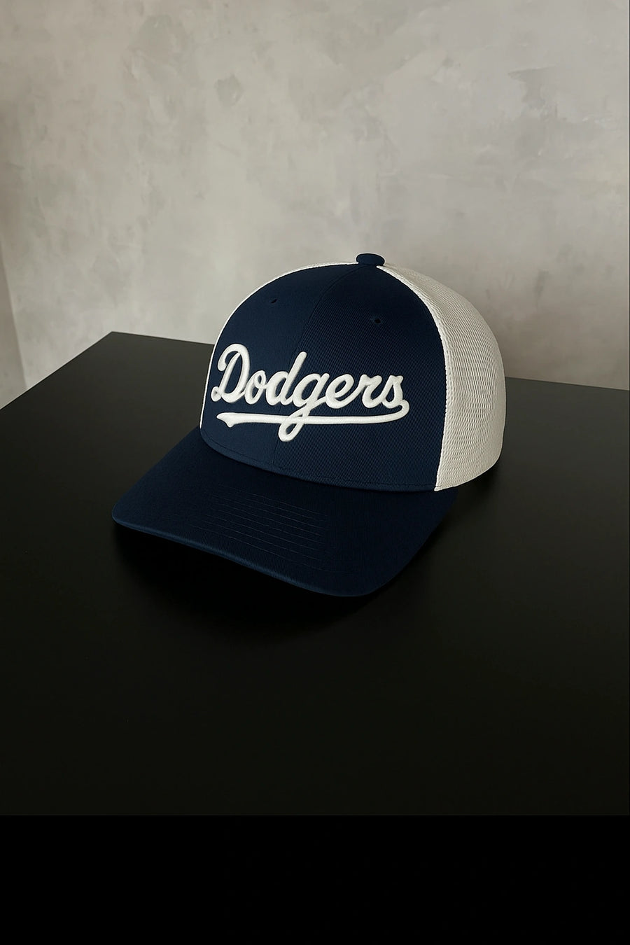 O Boné Dodgers combina frente em tecido encorpado com laterais em mesh respirável, criando um equilíbrio entre presença forte e uso confortável.